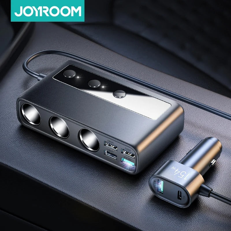 Mantén todos tus dispositivos cargados mientras conduces con el Adaptador de Cargador para Coche Joyroom 154W, diseñado para ofrecer la máxima eficiencia y seguridad en tus viajes.