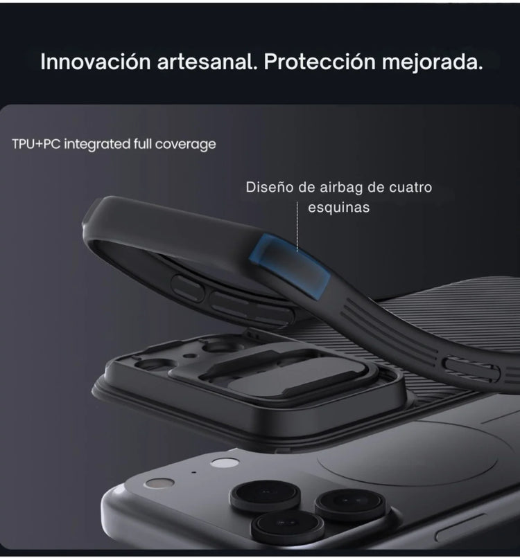 Protege tu iPhone 17 Pro Max de forma elegante y funcional. La funda CamShield Pro Magnetic de Nillkin incorpora un deslizador para cubrir la cámara, materiales resistentes y magnetismo MagSafe, todo en un diseño que cuida tanto la estética como la seguridad de tu equipo.