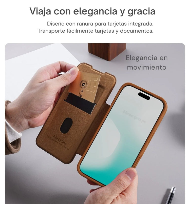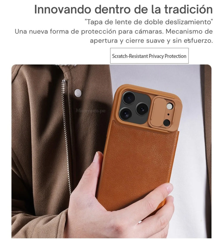 Elegancia clásica y protección inteligente para tu iPhone 17 Pro Max. La funda Nillkin Qin Pro combina cuero premium, carcasa rígida y un diseño funcional con ranuras para tarjetas y tapa deslizante para la cámara.