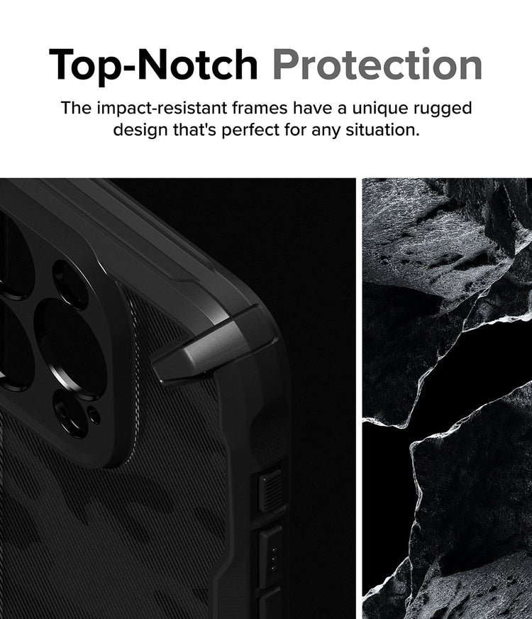 Ringke Fusion X combina 2 materiales en 1: bordes parachoques de TPU flexibles y posterior de Policarbonato de doble capa rígido. Además posee certificación MIL-STD 810G - 516.6 (Prueba profesional de impacto durante 26 veces seguidas a 1.2m de altura).
