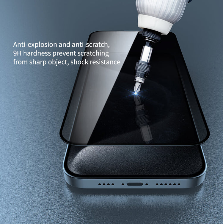 Protege tu privacidad con el Protector de Pantalla Vidrio Nillkin Anti-espía para iPhone 15 Pro Max. Con vidrio AGC importado de Japón, dureza 9H antiexplosión y antiarañazos, revestimiento antideslumbrante y oleofóbico, y un grosor de 0,33 mm para una sensación natural al tacto. ¡Mantén tu pantalla protegida con estilo!