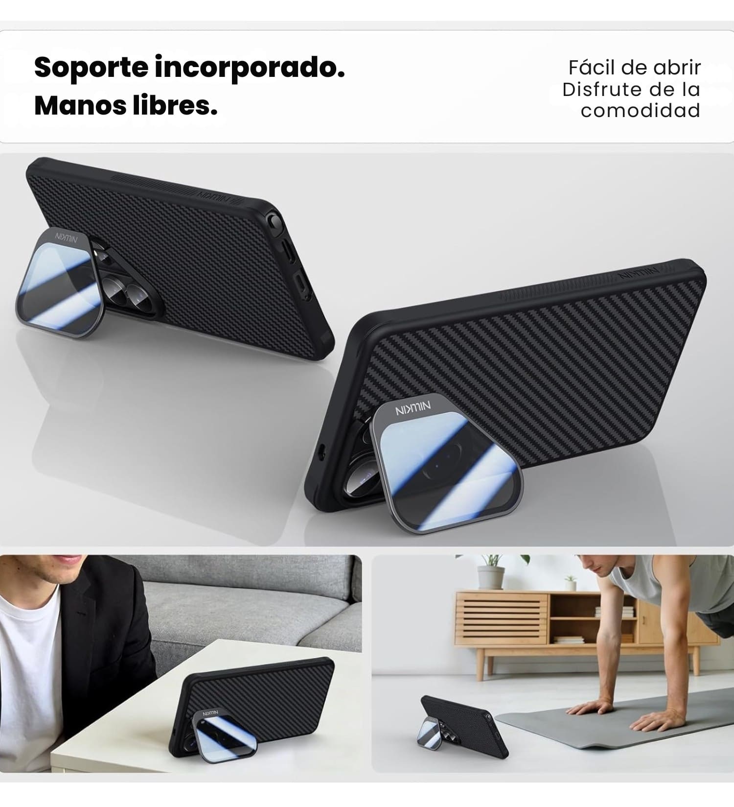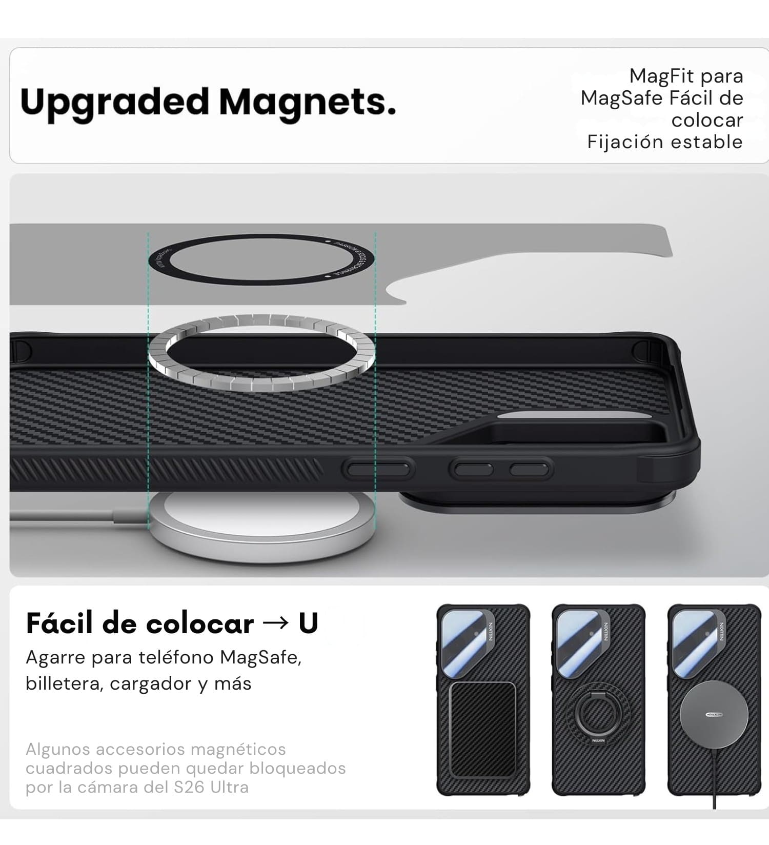Experimenta la máxima sofisticación y resistencia con la Funda Nillkin CarboProp Magnetic para Samsung Galaxy S26 Ultra. Fabricada con auténtica Fibra de Aramida (conocida como el "kevlar®"), esta funda ofrece una protección de grado aeroespacial en un perfil ultra delgado. Su marco de metal no solo resguarda las cámaras, sino que se despliega como un soporte premium, mientras que su potente imán interno garantiza una compatibilidad MagSafe total.